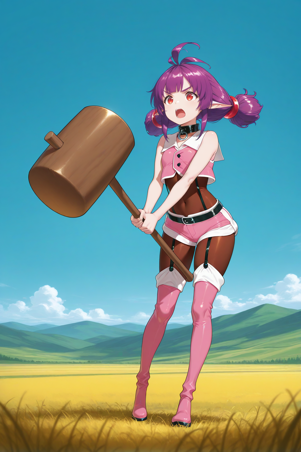 Add "black collar, pink vest, bodystocking, sleeveless, black belt, pink shorts, garter straps, pantyhose, thigh boots, pink boots" for her typical look.