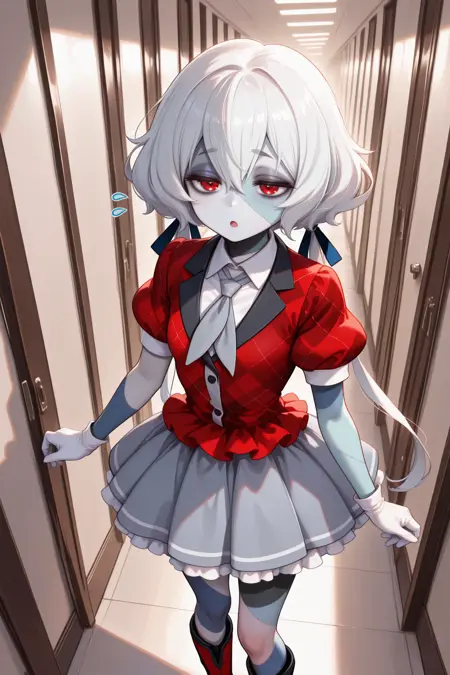 저글 룩을 원할 경우 "zmjk, 빨간 눈, 파란 피부, 회색 피부, 컬러드 피부, 패치워크 피부, 봉합선, 흰 머리, 낮은 트인테일, 긴 머리, 눈 사이의 머리카락, 머리 리본, 학교 유니폼, 검은 드레스, 해군 복, 검은 해군 칼라, 흰 목수건, 긴 소매, 흰 양말, 검은 신발"을 추가하세요.