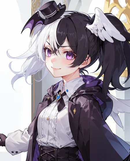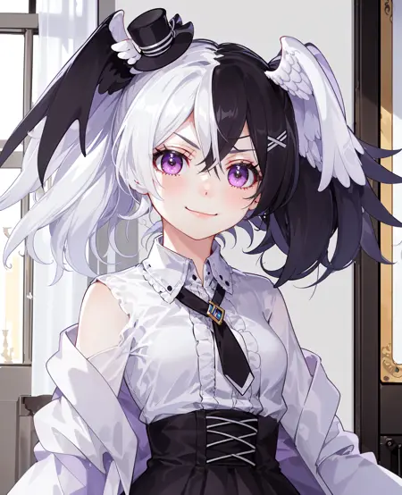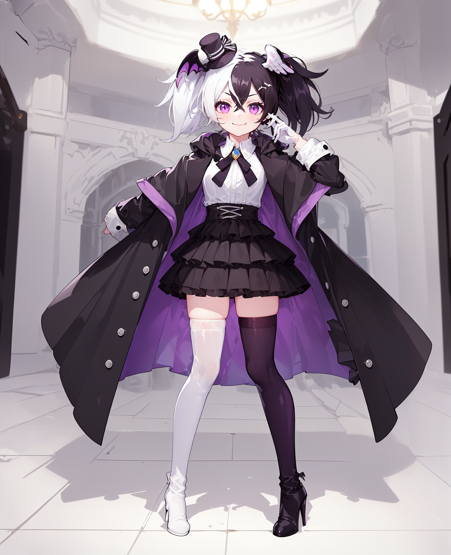 For her default costume: white shirt, coat, high heel boots, mismatched legwear, mini hat, head wings.