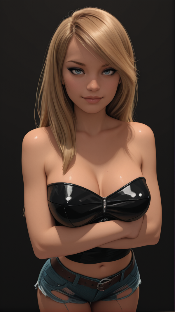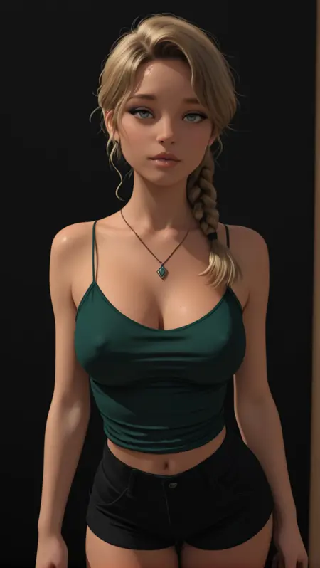 rtmepilogue_mia,金色头发,蓝色眼睛,嘴唇,中等胸部,马尾辫,编发,波浪发,口红,眼线,绿色背心,低胸领口,细肩带,乳沟,露腹,黑色短裤,超短裤,项链