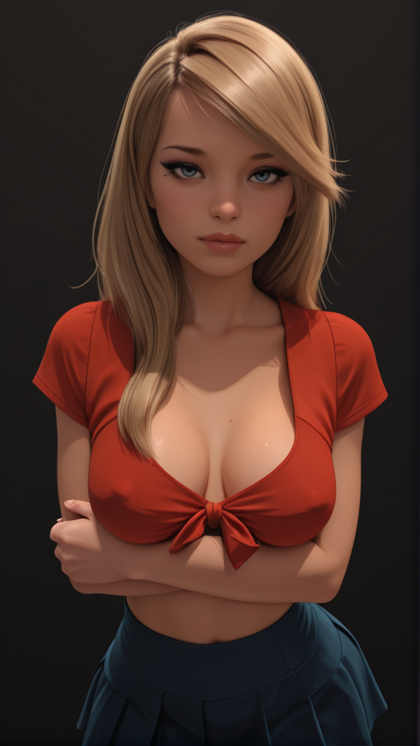 前系式上衣,短款上衣,短袖,深V领口,露腹,红色上衣,蓝色裙子,超短裙,褶皱裙
