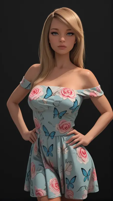 オフショルダードレス、花柄、ピンクのバラ、オレンジのバラ、青い蝶、肩出し、ショートドレス