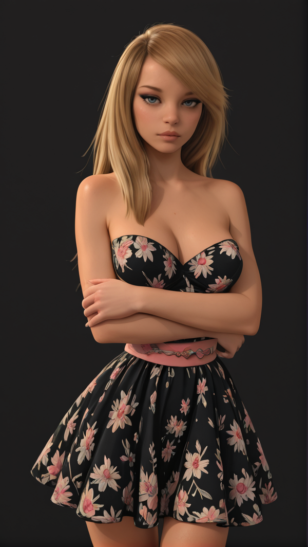 无肩带连衣裙,无袖,裸露肩膀,乳沟,黑色连衣裙,花卉图案,多色花朵,薰衣草色花朵,薰衣草色腰带,丝带腰带,薰衣草色裙摆,短裙