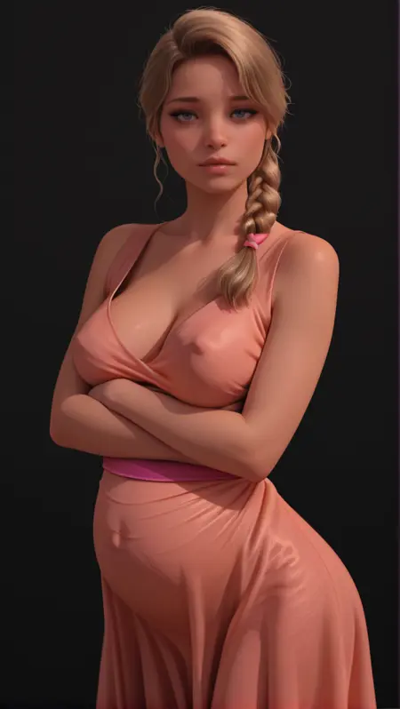 rtmepilogue_pregmia、金髪、青い目、唇、中程度の胸、ポニーテール、編み込み、ウェーブヘア、リップスティック、アイライナー、妊娠中