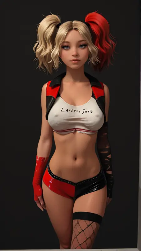 rtm_mia,蓝色眼睛,嘴唇,分刘海,高双马尾,凌乱头发,多色头发,金色头发,红色头发,金色双马尾,红色双马尾,中等胸部,口红,眼线,猫眼眼线,眼影,哈莉·奎茵服装,短款背心,无袖,短款背心,破烂上衣,多色上衣,白色上衣,黑色上衣,多色背心,黑色背心,红色背心,露指手套,长袖手套,黑色手套,红色手套,破烂手套,露腹,超短裤,多色短裤,红色短裤,黑色短裤,低腰短裤,高开衩腿部短裤,亮面短裤,单侧长筒袜,不对称腿饰,渔网长筒袜,撕破渔网
