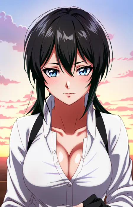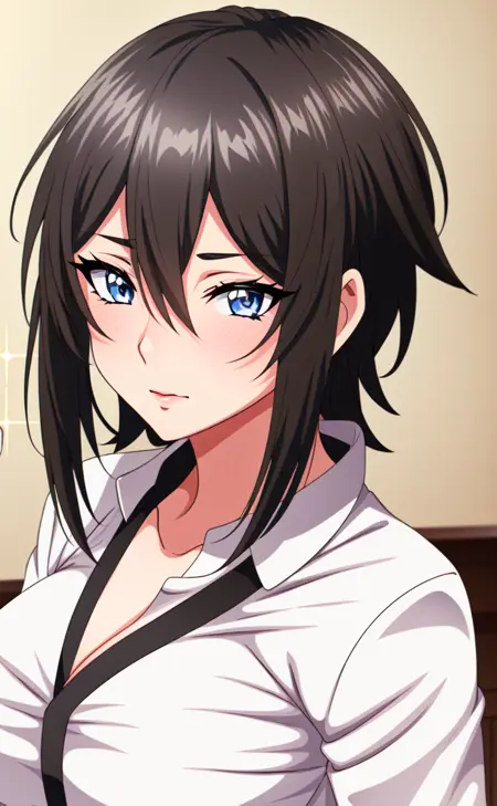 埃尔娜·斯通斯,灰色眼睛,胸部,乳沟,露指手套,手套,衬衫,黑发,中等胸部,白衬衫,白天,黑色手套,锁骨,侧刘海,刘海,头发位于眼睛之间