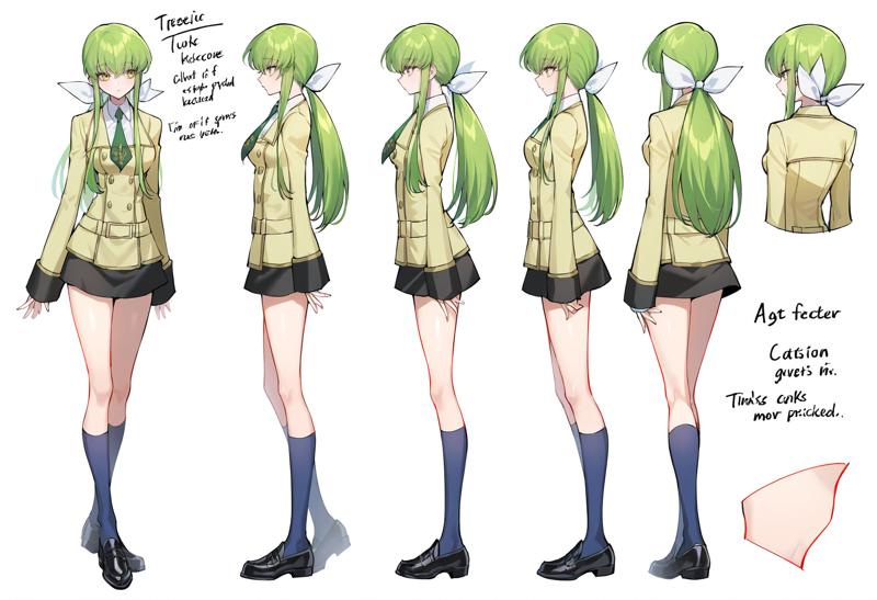 School Unifrom: ponytail, hair between eyes, medium breasts,ashford academy school uniform,skirt,green necktie,school uniform,black footwear,socks,black skirt,necktie,jacket,miniskirt,shirt,collared shirt,loafers,long sleeves,shoes,white shirt,yellow jacket,kneehighs,ribbon,hair bow,white ribbon,breasts,bow,wing collar,white bow,hair ribbon,pleated skirt,blazer,blue socks,shiny hair,sleeves past wrists,brown jacket