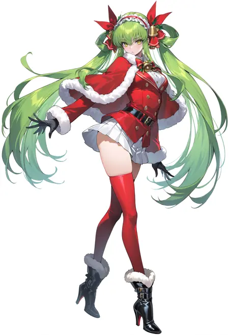 Chrismas Outfit: hair between eyes,twintails,medium breasts,thighhighs,boots,high heels,gloves,capelet,high heel boots,fur trim,black gloves,black footwear,skirt,hair rings,red capelet,red thighhighs,bow,hairband,hair bow,fur-trimmed capelet,santa costume,alternate costume,miniskirt,breasts,bell,zettai ryouiki,fur-trimmed boots,red bow,ribbon,pleated skirt,dress,ankle boots,hair ornament,hair ribbon,frilled hairband,frills,thighs,buttons,alternate hairstyle,jacket,shirt,red ribbon