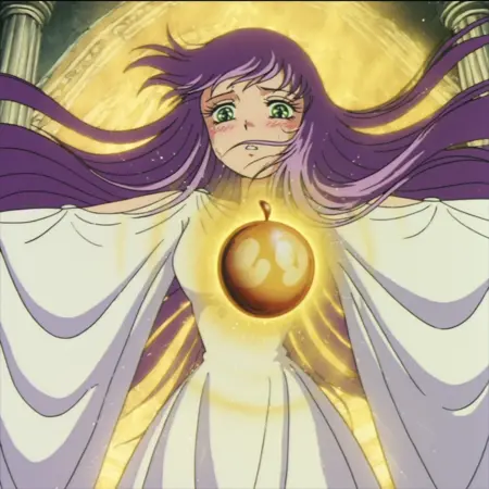 试作1号。这是一个用于输出1987年上映的剧场版动画《圣斗士星矢》女主角“城户沙织”被金色苹果吸走生命力场景的LoRA。请先仅使用触发词和“1girl”进行测试,之后可酌情尝试应用其他角色的LoRA。