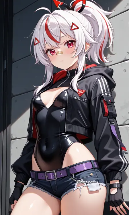 Melware,发饰,多色头发,白发,红发,侧发,条纹发,三角发饰,双色发,红眼,小乳房,乳房,大腿,马尾,创可贴,脸上有创可贴,鼻上有创可贴,腰带,黑色手套,黑色紧身衣,黑色腰带,牛仔布,黑色牛仔短裤,无指手套,黑色手套,兜帽,兜帽下垂,连帽夹克,夹克,紧身衣,紫色腰带,超短裤,短裤,黑色兜帽,黑色夹克,黑色短裤