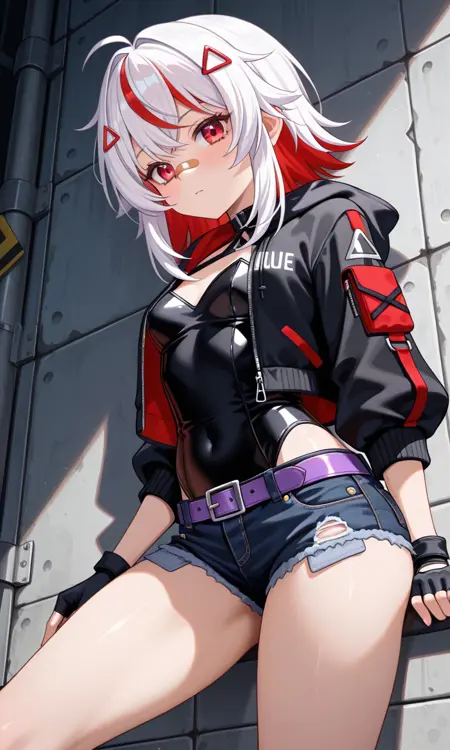 Melware,发饰,多色头发,白发,红发,侧发,条纹发,三角发饰,双色发,红眼,小乳房,乳房,大腿,中等长度头发,创可贴,脸上有创可贴,鼻上有创可贴,腰带,黑色手套,黑色紧身衣,黑色腰带,牛仔布,黑色牛仔短裤,无指手套,黑色手套,兜帽,兜帽下垂,连帽夹克,夹克,紧身衣,紫色腰带,超短裤,短裤,黑色兜帽,黑色夹克,黑色短裤