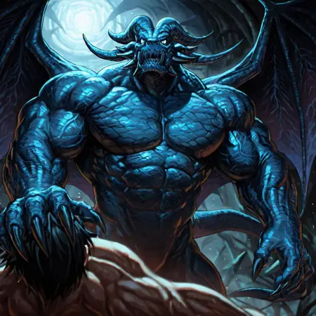 ◇양대 악마, 마법사, 악마, 남성, 근육질, 복근, 뿔, 이빨, 발톱, 입, 눈, 하얀 눈, 파란 피부, 큰 근육,
