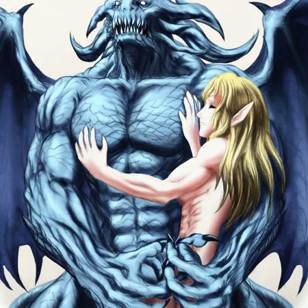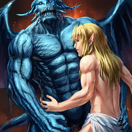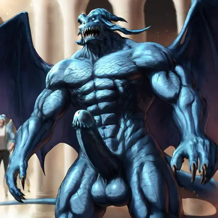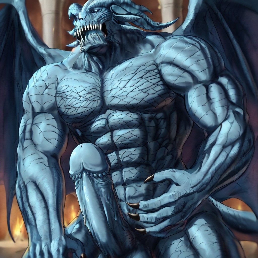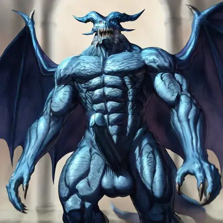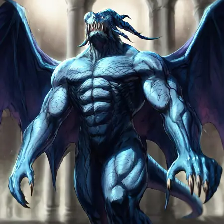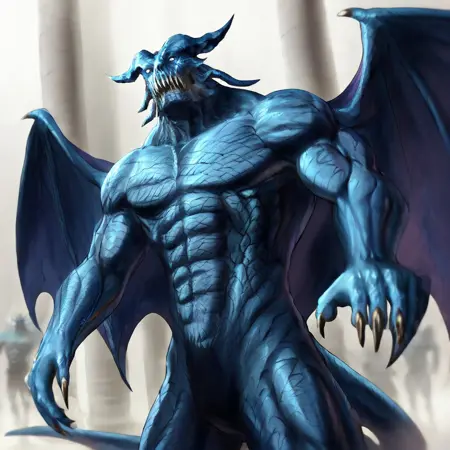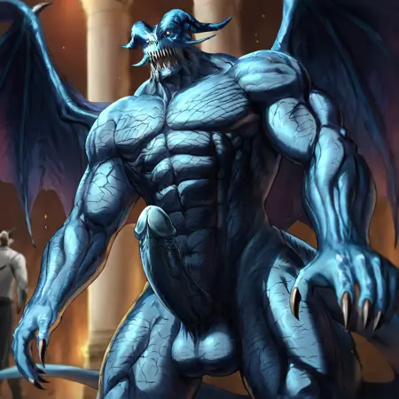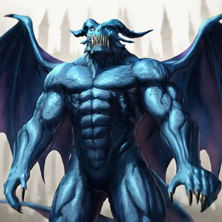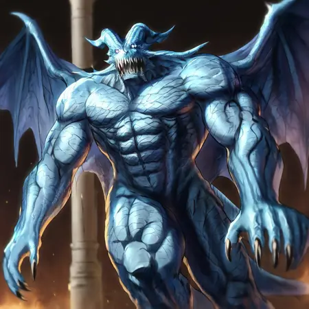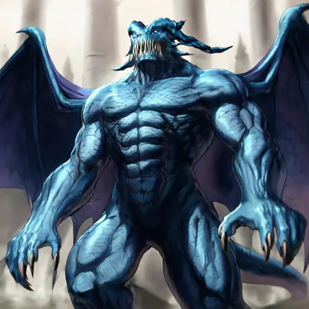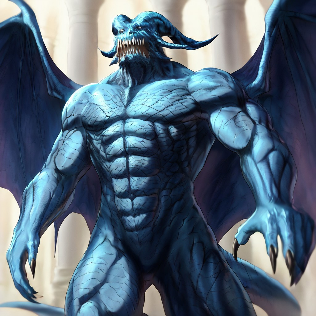 ◇양대 악마, 마법사, 악마, 남성, 근육질, 복근, 뿔, 이빨, 발톱, 입, 눈, 하얀 눈, 파란 피부, 큰 근육,