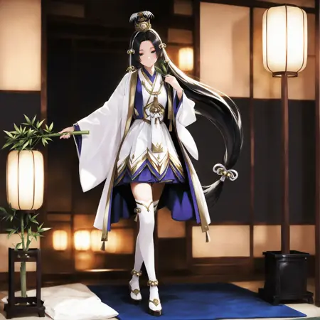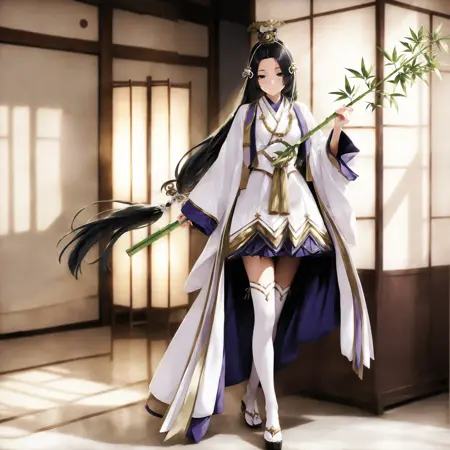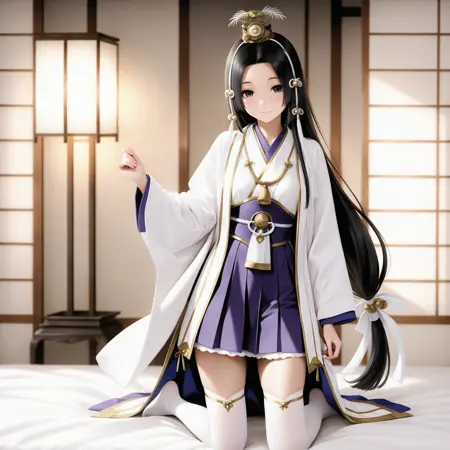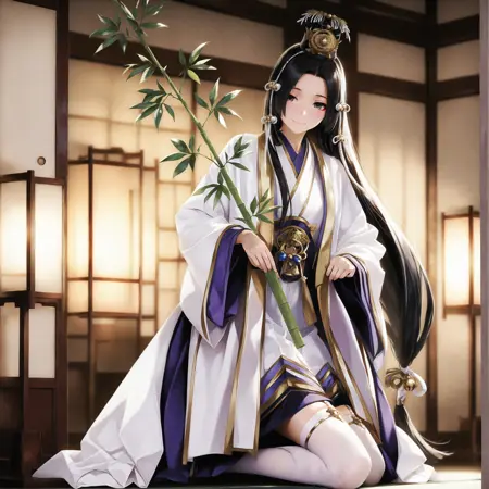 基础触发词:1 girl,solo,kaguya,black hair,very long hair,low-tied long hair,hair ornament,black eyes,japanese_clothes,purple collar,wide_sleeves thick white thighhighs,scandals,