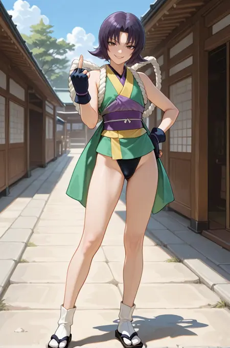 该LoRA主要基于原版动画中的形象进行训练——紫色头发和绿色和服——但通过调整提示词,你可以生成更贴近漫画和动画重制版的形象——红褐色头发和粉紫色和服。