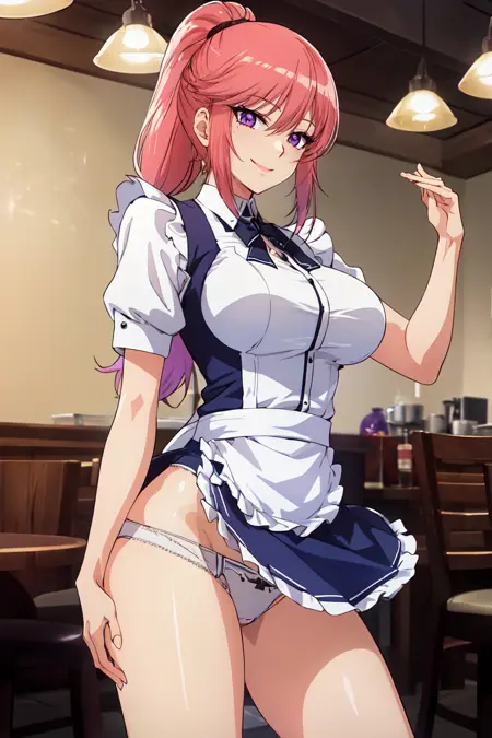 大腿镂空有时不会出现。增加权重有助于解决,但也可能破坏画面(不推荐)。紧身衣碎片可能持续存在,如有需要可加入负向提示。此外,数据集中包含一些校服图像,如果服装出现在某处(可能性较小),请将“校服”加入负向提示。你可以尝试复现她的内衣,但数据量小,不够准确,可尝试使用粉色内衣搭配其他标签。