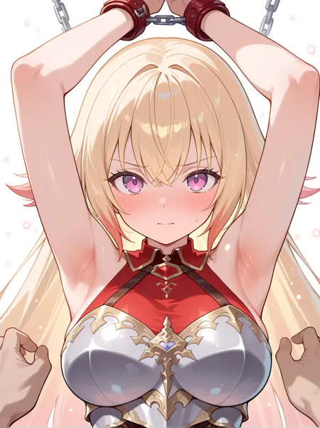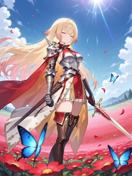 タグ(衣装):黒のレオタード、鎧のようなドレス、黒の thighhighs、高めのブーツ、ガントレット、片側のパウルドロン、プリーツスカート、