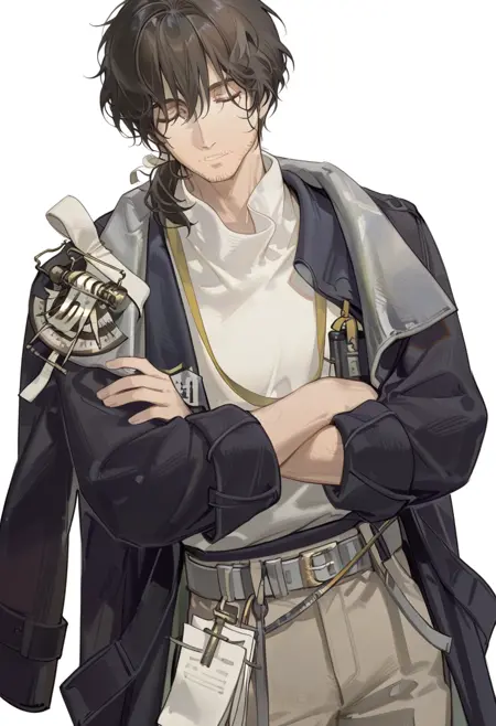 short hair,brown pants,open clothes,pants,low ponytail,mature male,stubble,hair between eyes,black coat,brown hair,bangs,lora:reverse1999\_enigma:0.9,