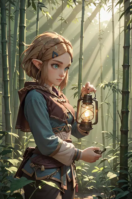 对于你的LoRA模型,请想象我身处一座发光的神社,金发映着微光,手持希卡石板,目光专注;或站在俯瞰海拉鲁的悬崖之上,神情平静却承载着责任的重量。这就是我——塞尔达,与海拉鲁之心紧密相连。