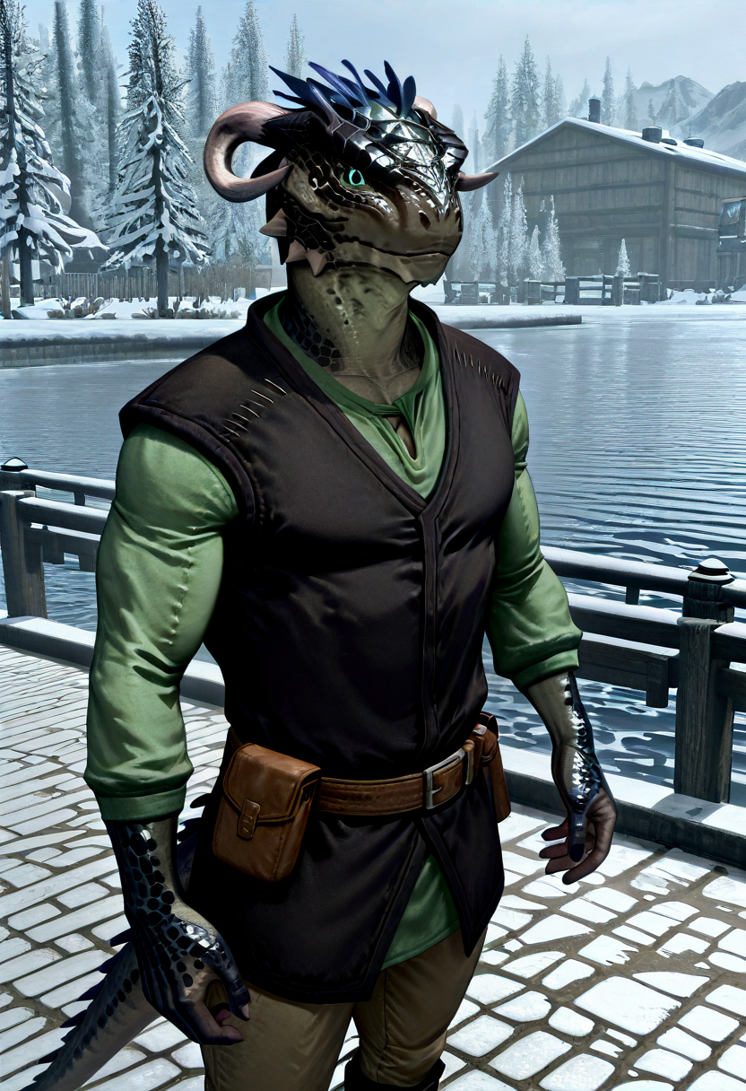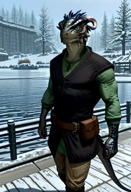Scouts-Many-Marshes, Argonian, Lizard Boy, Olive green scaly skin, Light green eyes, Curved horns, Green long sleeved tunic, Dark vest, Belt, Belt bag, Boots
