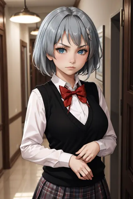 • 添加 "发饰、针织背心、有领衬衫、领结、长袖、格子裙" 以获取她的校服。