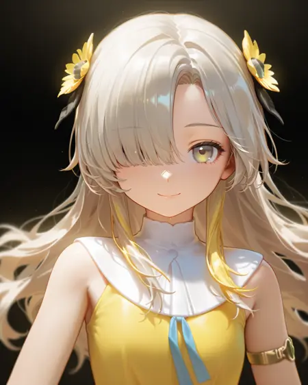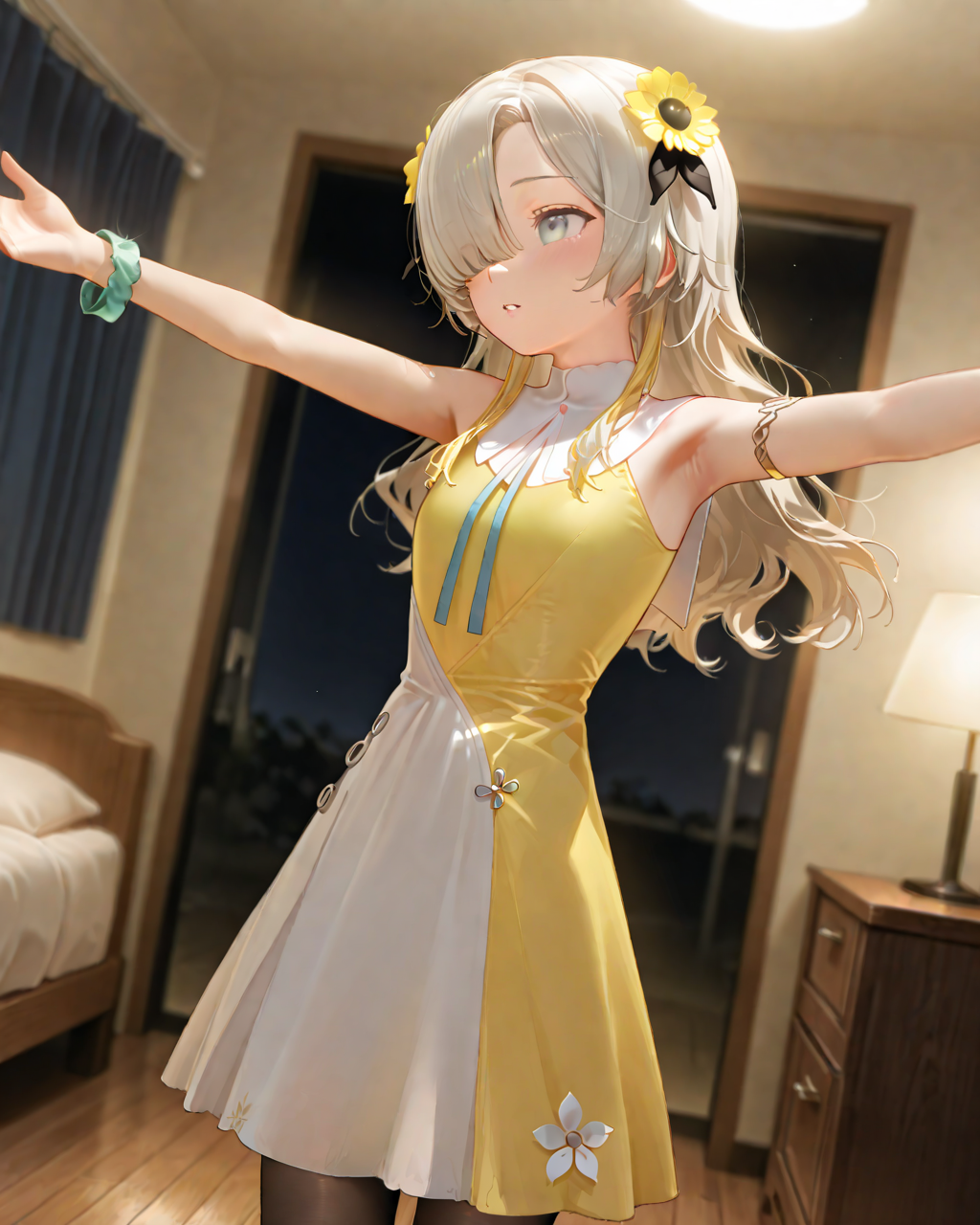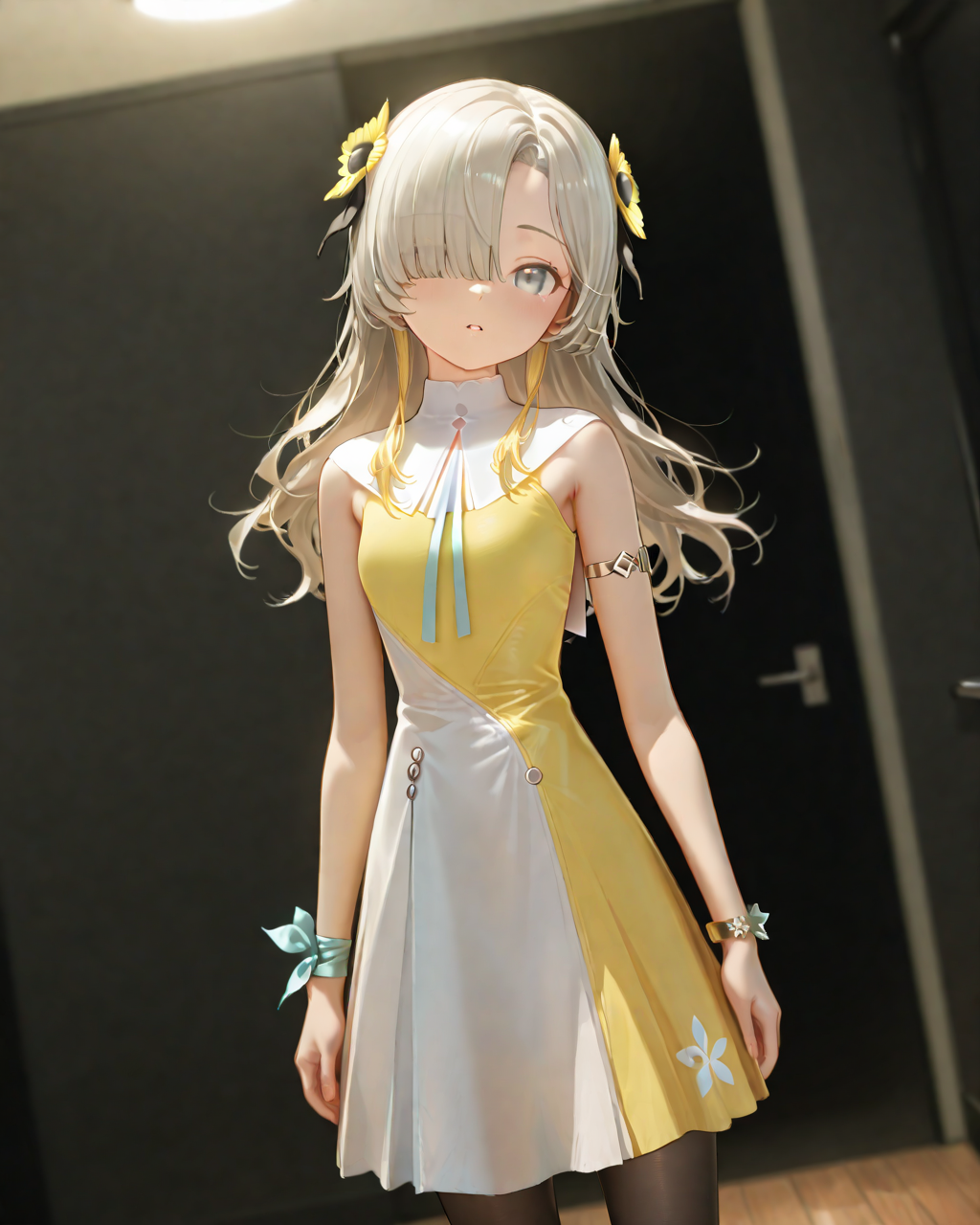 isekaijoucho, yellow_hair_flower, yellow_hair_extention, gray_hair, wavy_hair, hair_over_one_eye, gray_eye, two-tone_dress, sleeveless, blue_armband, gold_bracelet, black_pantyhose, white_boots