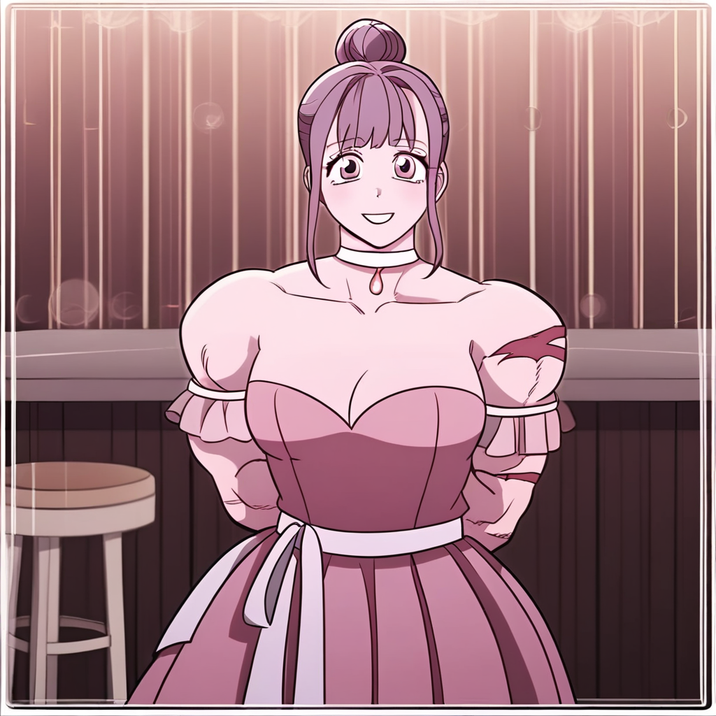 (( lora:ladydorothy\_m1c8:1 , ladydorothy_m1c8, beautiful pink eyes, clear eyes, bright pupils, beautiful eyes, beautiful pink hair, beautiful hairbun, bangs, sidelocks, huge and shaggy breasts, wide hips, muscular body, beautiful skin, multiple gruesome scars around her body, natural beauty, extraordinary beautiful muscular woman, attractive muscular woman, super sexy muscular woman, lustful muscular body, sexy woman with seductive obscene muscular body, sensual muscular body, voluptuous muscular body, sexy muscular beauty, ))