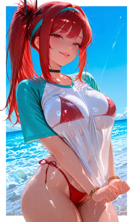 빨간 비키니, 스트링 비키니, 마이크로 비키니, 하이레그 비키니, 사이드 타이 비키니 아래, 옷 안에 비키니, 투명, 티셔츠, 짧은 소매, 라그란 소매, 팔찌, 팔찌, 파란색 머리끈, 머리 장식, 검은 목걸이, 샌들, 플립플롭,