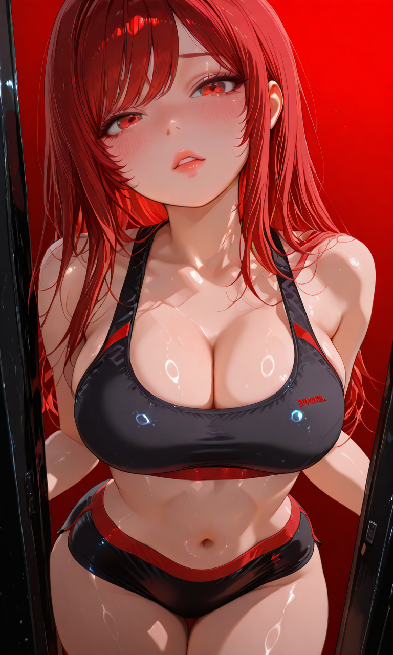 rapiRH, 빨간 머리, 빨간 눈, 긴 머리, 큰 가슴, 단발머리, 옆머리,