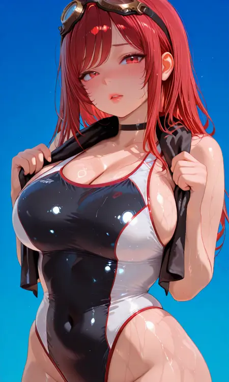 ワンピース水着, ブラックワンピース水着, ホワイトワンピース水着, コンペティション水着, ハイレグ水着, サンダル, フリップフロップ, ホワイトシューズ, ブラックチョーカー, 頭にゴーグル, 首にタオル,