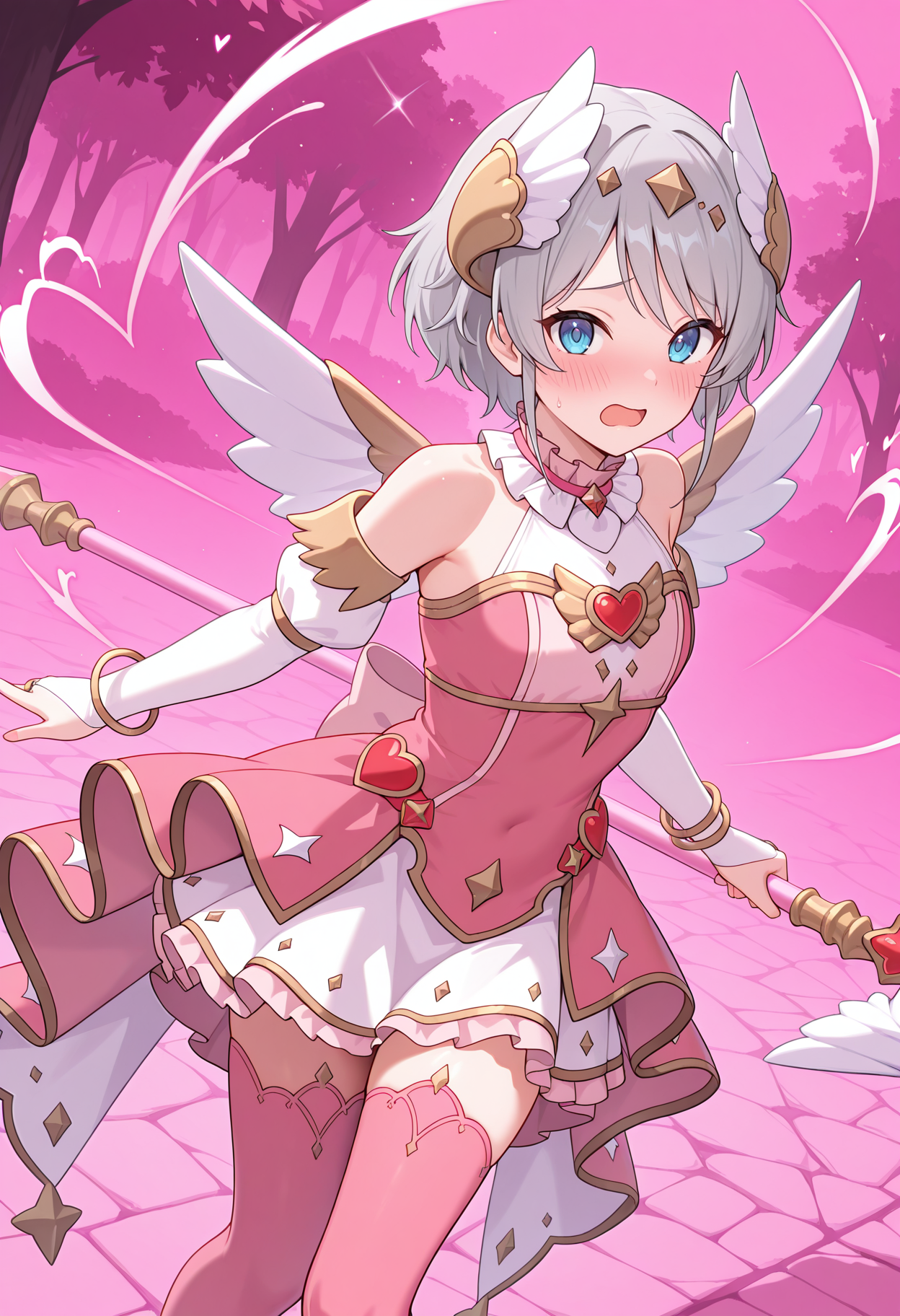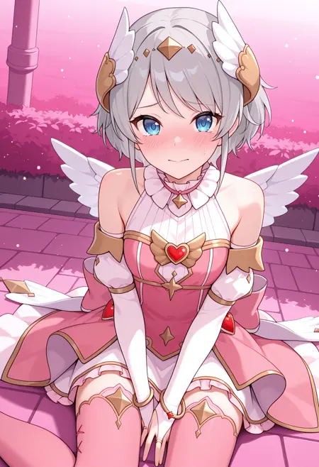 • pyoriang, 翅膀发饰, 白色上衣, 花边领, 肋纹上衣, 粉色裙子, 露肩, 心形装饰, 翅膀装饰, 分离式袖子, 白色袖子, 手镯, 婚礼手套, 白色裙子, 外裙, 粉色过膝袜, 白色翅膀,