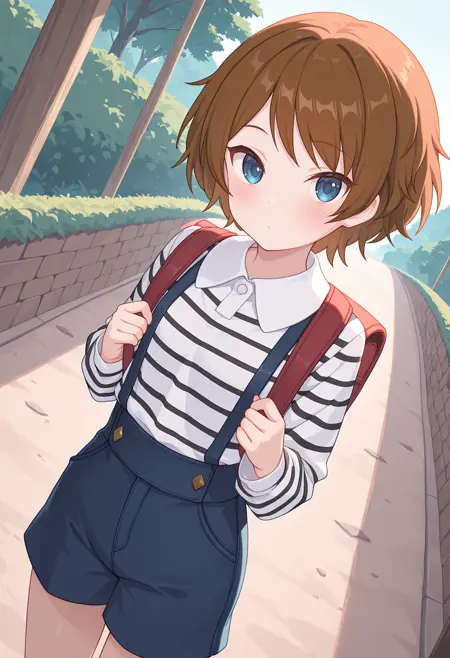 • 条纹衬衫, 黑色条纹, 有领衬衫, 白色衬衫, 长袖, 背带, 蓝色短裤,