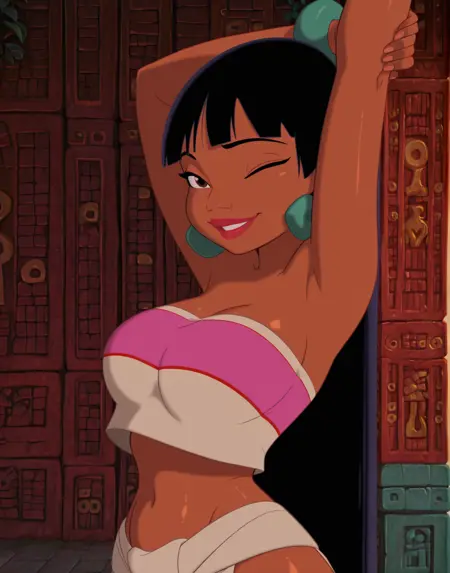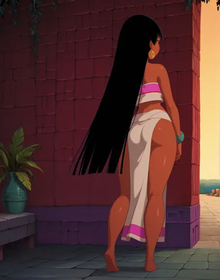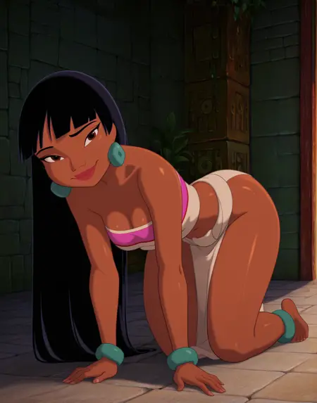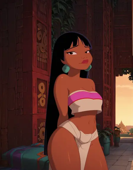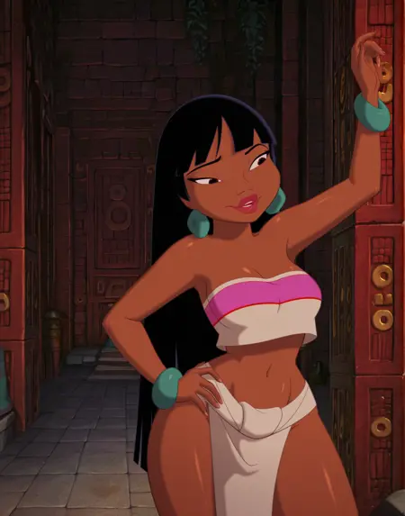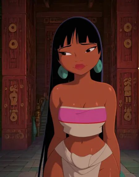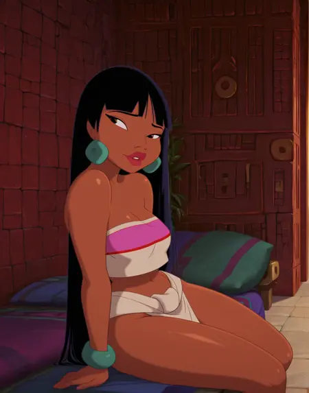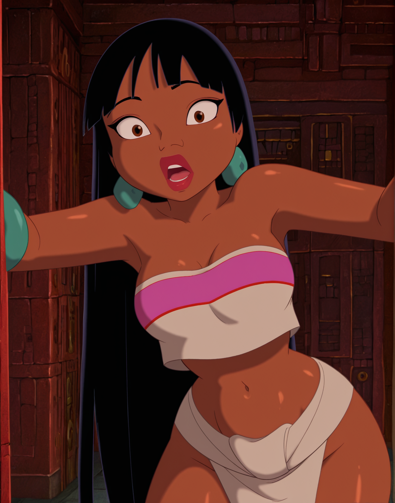 trtelche, chel, (the road to Eldorado), black hair, bangs, long hair, dark-skinned female, midriff, tube top, loincloth, lips,