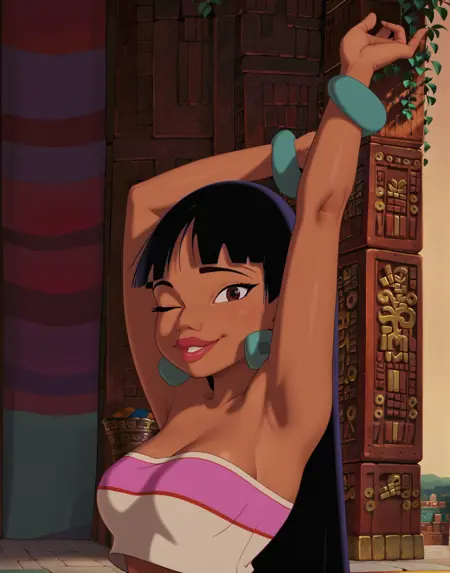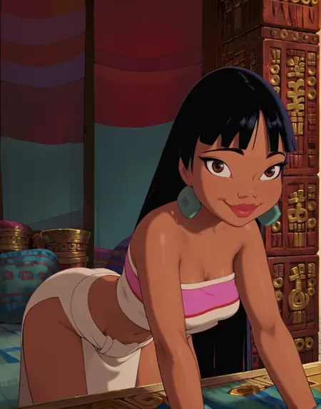 trtelche, black hair, bangs, long hair, dark-skinned female, midriff, tube top,