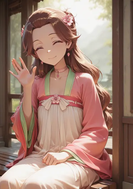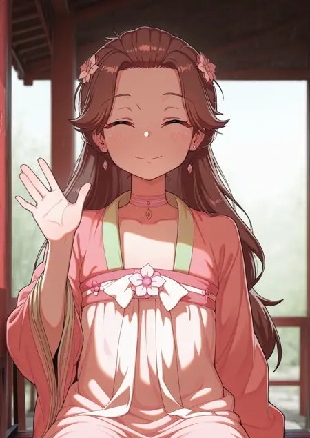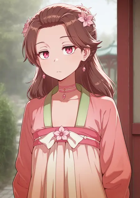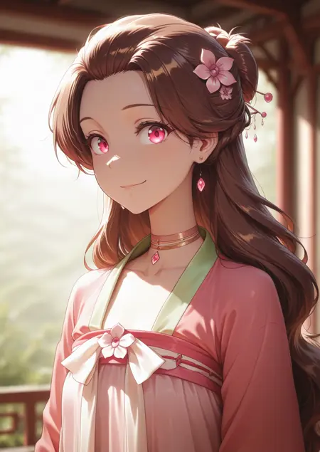 MingyueLi, brown hair, long hair, side bangs, pink eyes, flower hair ornament, hair behind ear,