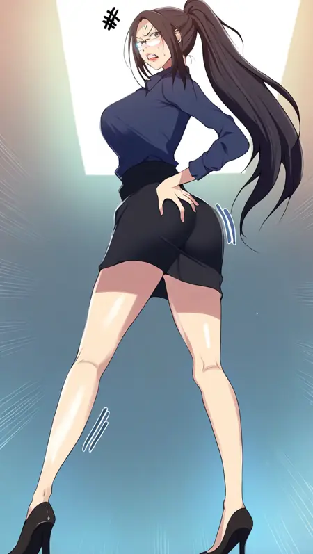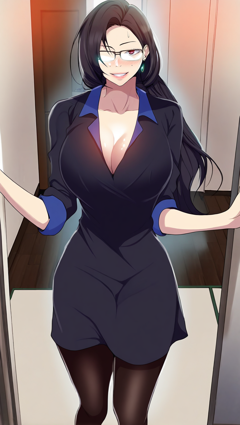 职业装,蓝色衬衫,黑色裙子,铅笔裙,乳房,大乳房,乳沟,高跟鞋,黑色高跟鞋,
