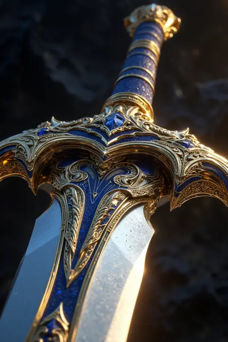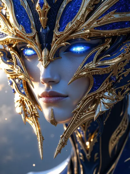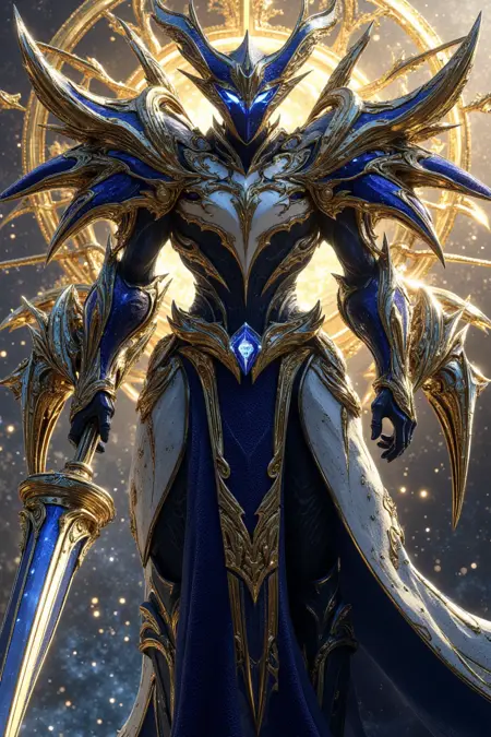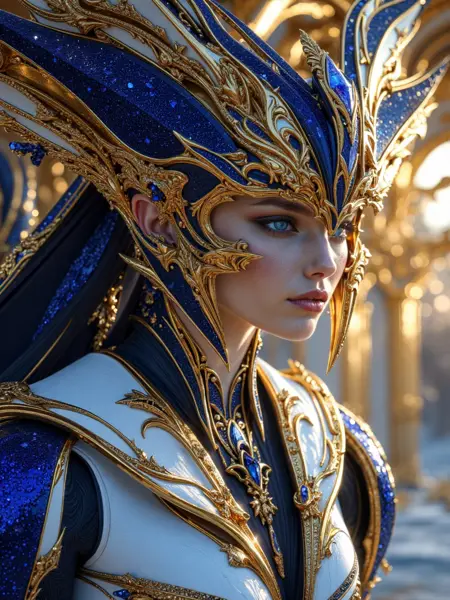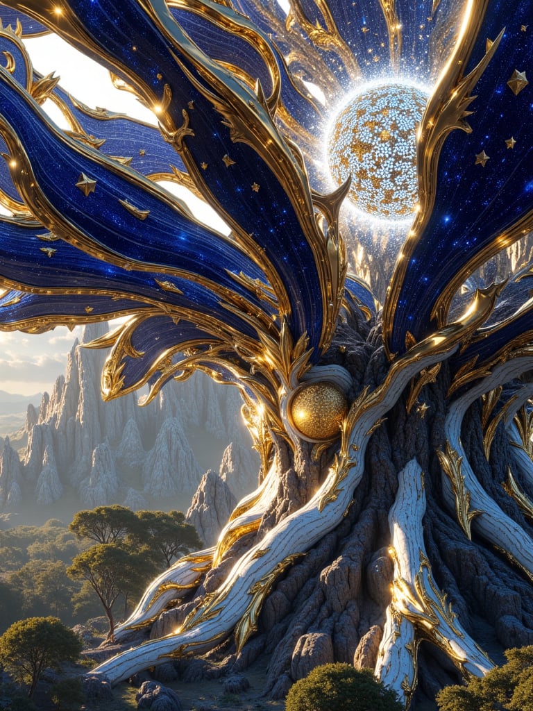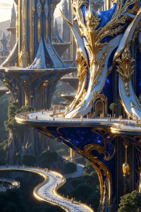 装飾的な金のキャラクター、建築物、木など、攻撃的な宇宙的な青色の突起が際立つ