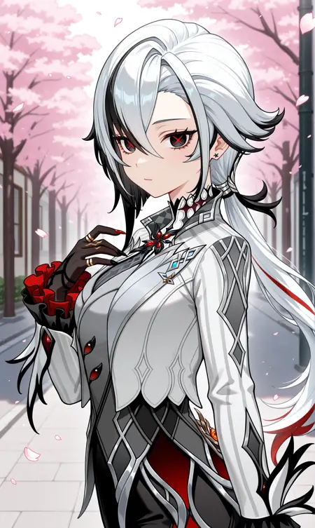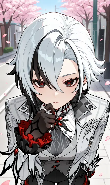 arlecchino (genshin impact), 多色の髪, 黒髪, 前髪, 白髪, 低めのポニーテール, 記号型の瞳, チャンネル入りの髪, 目の間に髪, X字型の瞳, 短い髪, 黒目, 赤い瞳, 二色の髪