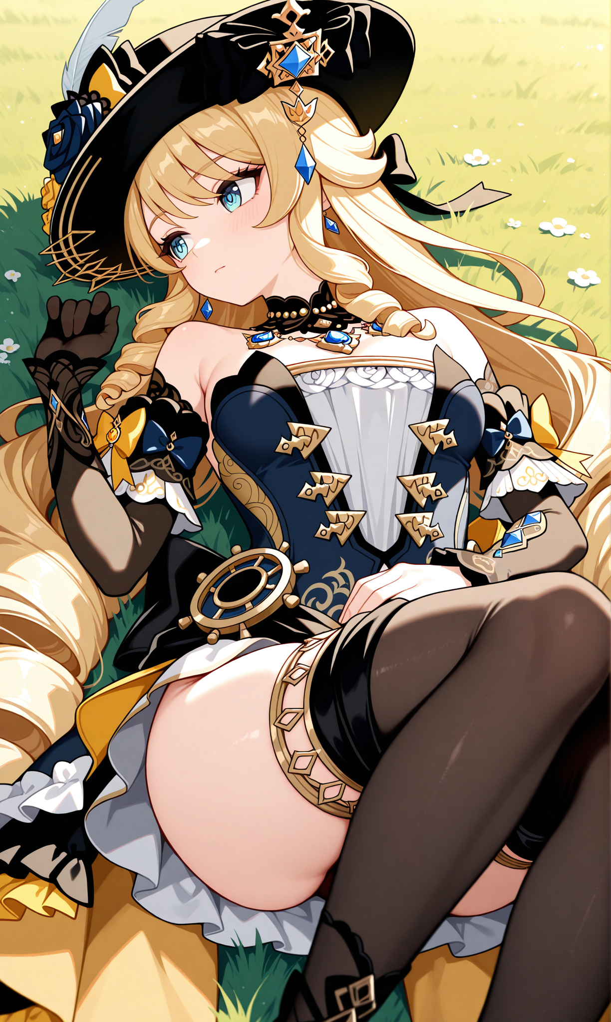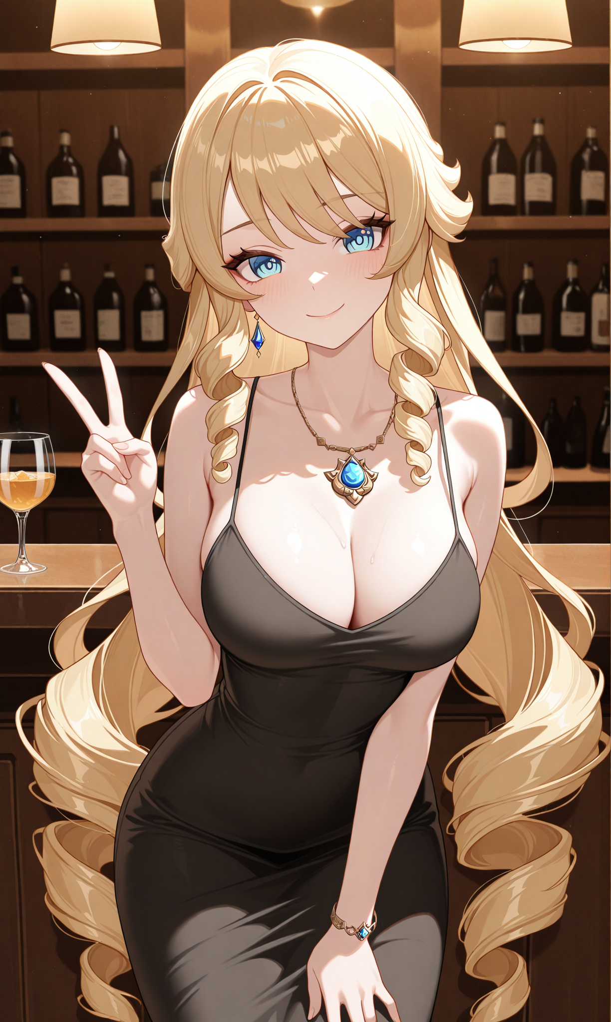 navia (genshin impact), blonde hair, long hair, blue eyes, drill hair, drill sidelocks