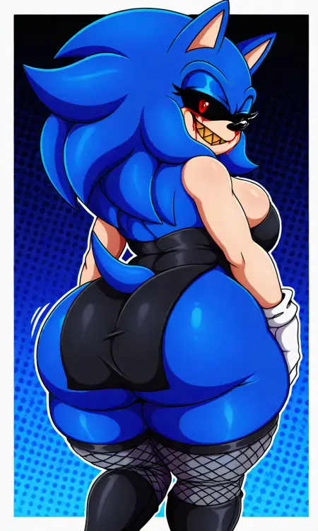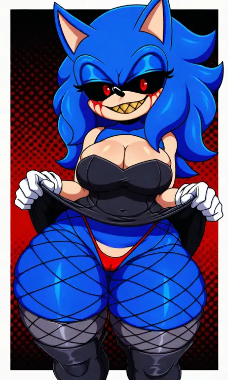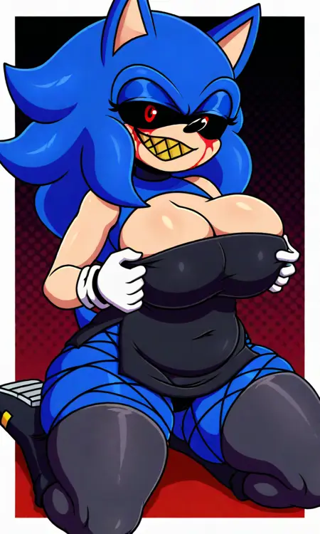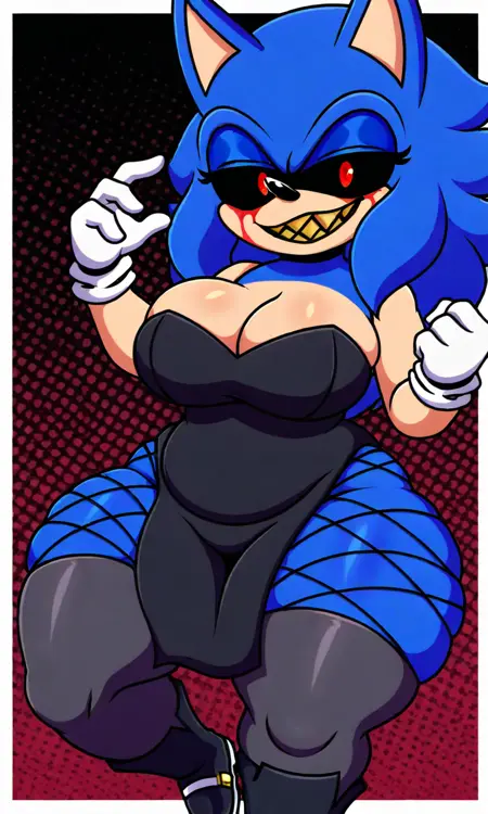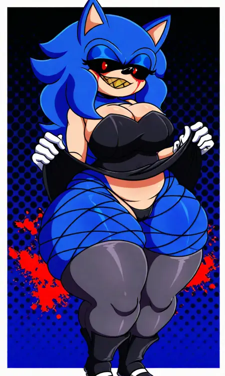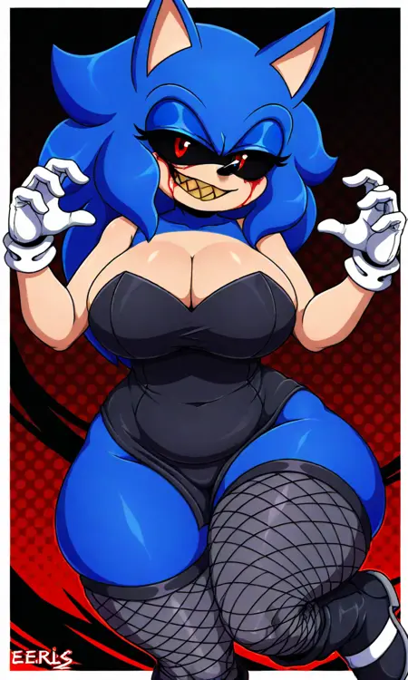 태그: er1s, 고슴도치, 파란 털, 검은 공막, 붉은 동공, 피로 물든 눈물, 날카로운 이빨, 흰 장갑, 검은 드레스, 피쉬넷 팬티스타킹, 회색 허벅지 양말, 검은 부츠