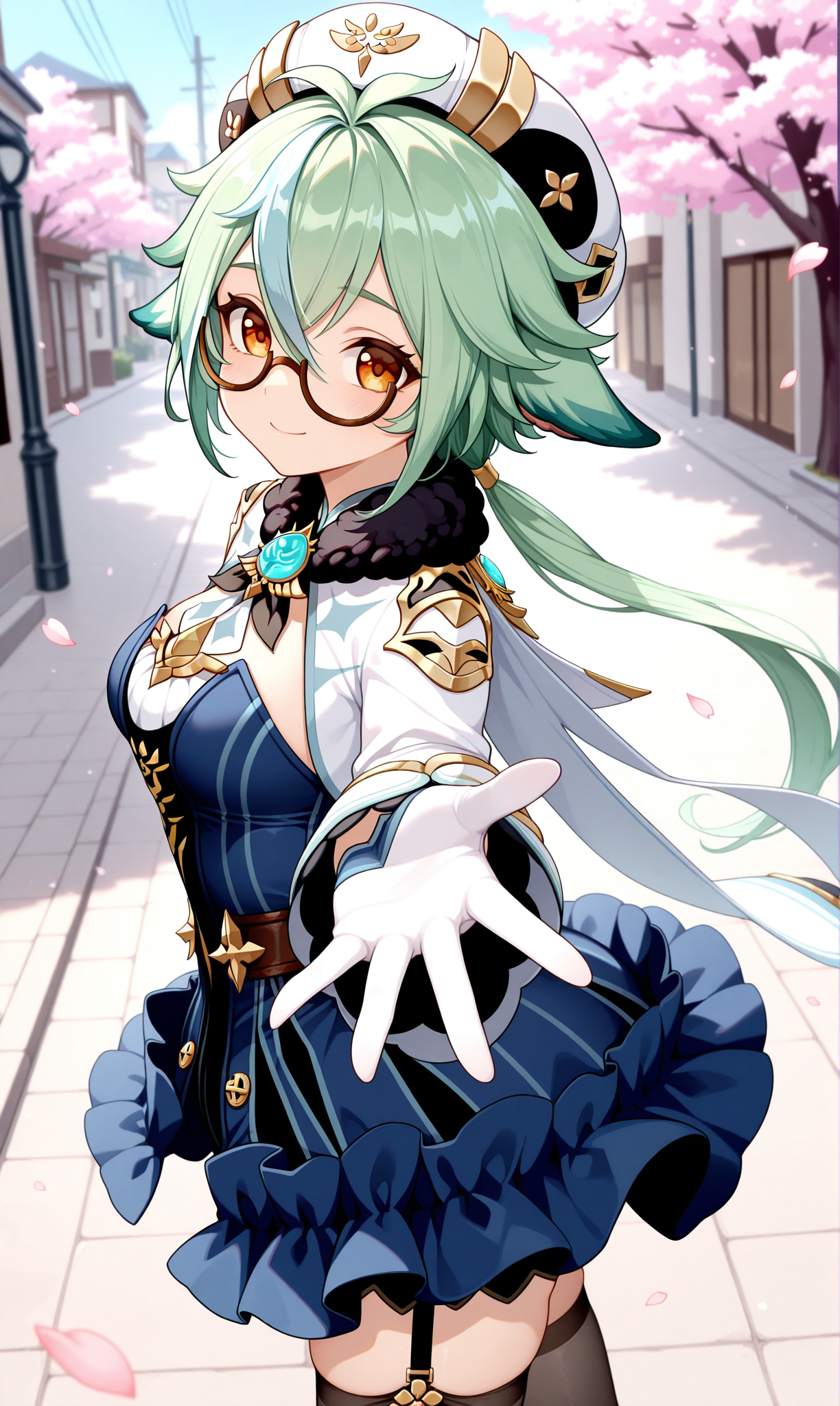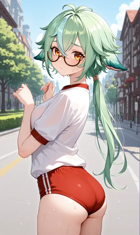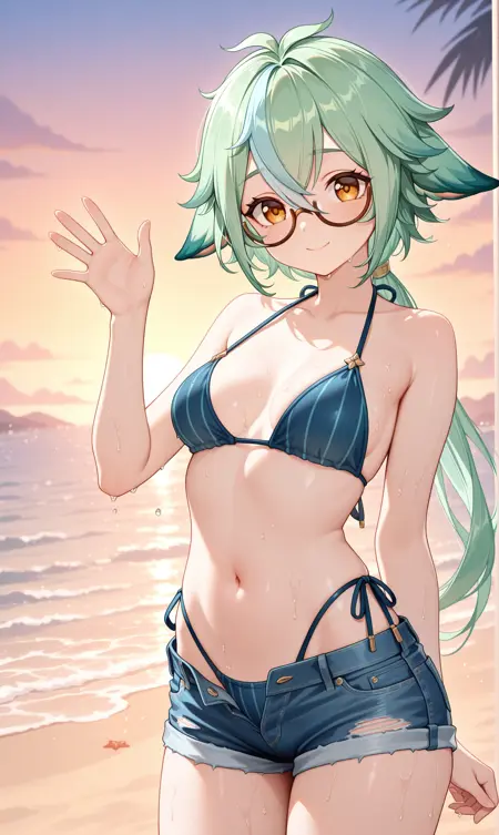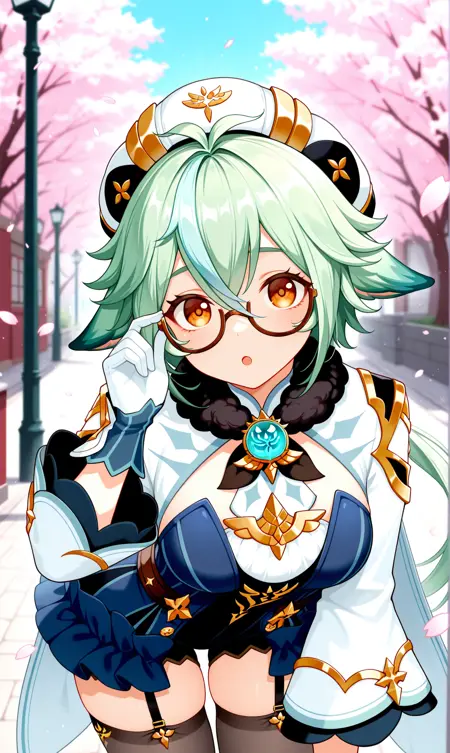 砂糖 (原神),绿发,动物耳朵,半框眼镜,棕色镜框,渐变发色,橙色眼睛,长发,头发遮眼,马尾