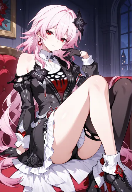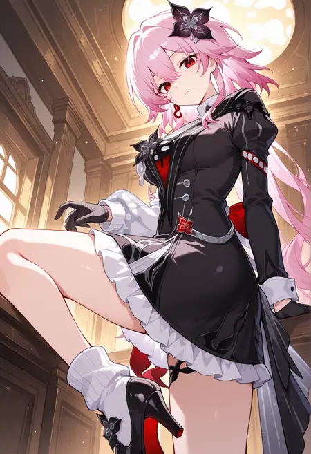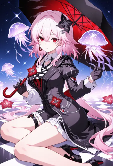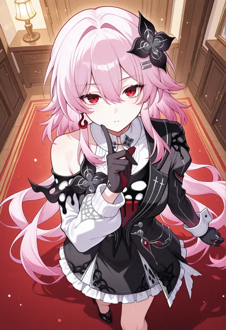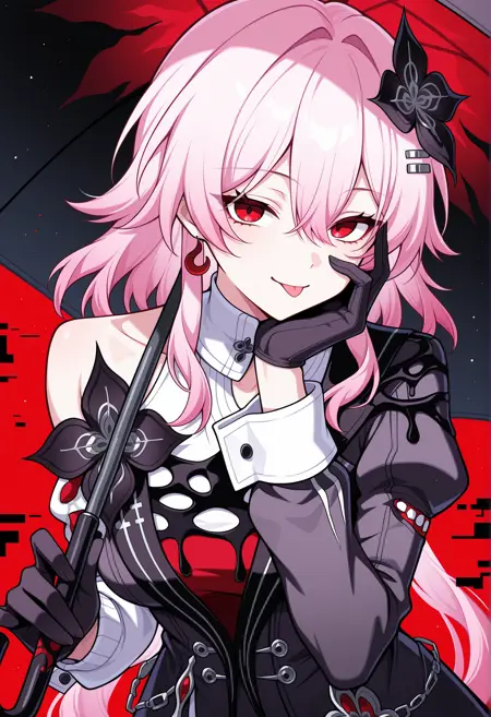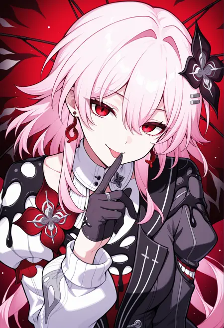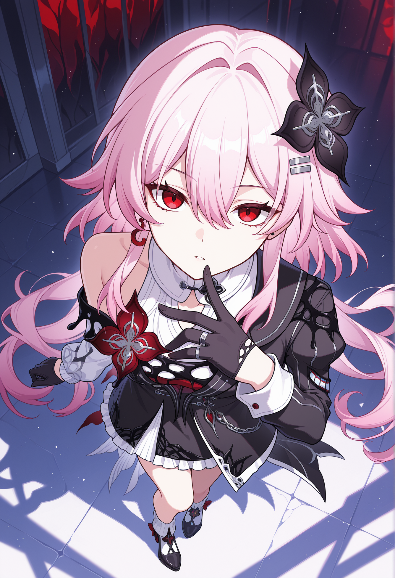 基本アクティブ化ワード: evernighthsr, 1girl, ピンクの髪, 目の間の髪, 髪飾り, 髪の花, 黒い花, 赤い目, 長い髪,