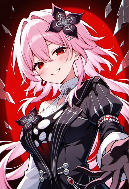 基本激活词: evernighthsr, 1girl, 粉色头发, 发丝遮眼, 头饰, 头发花朵, 黑色花朵, 红色眼睛, 长发,