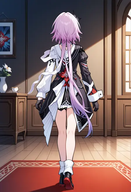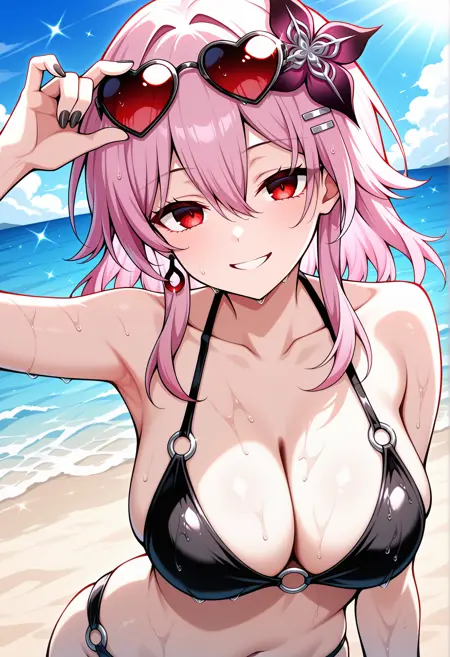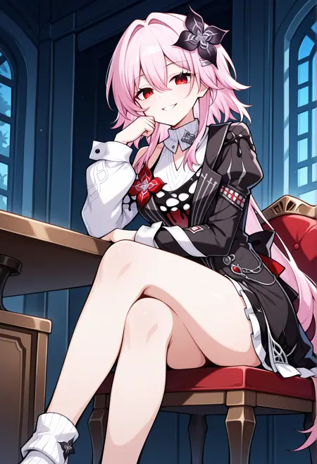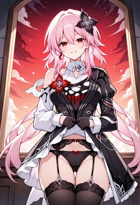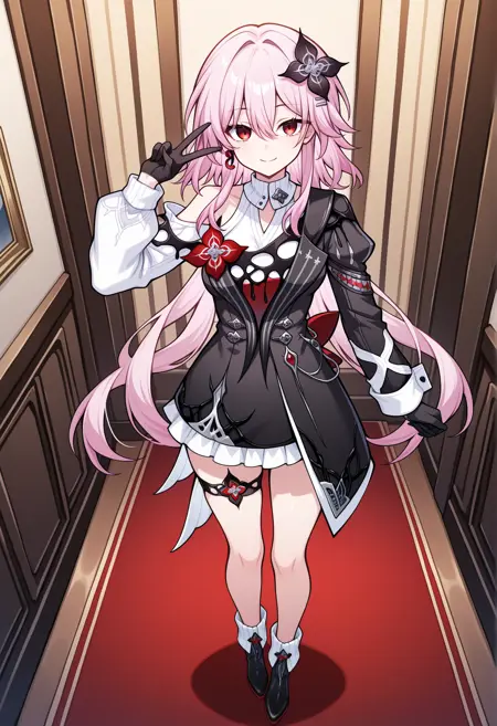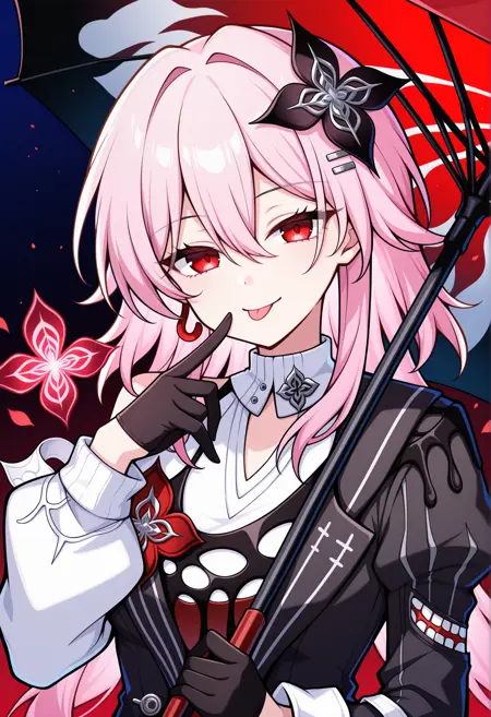 Basic activation words: evernighthsr, 1girl, pink hair, hair between eyes, hair ornament, hair flower, black flower, red eyes, long hair,