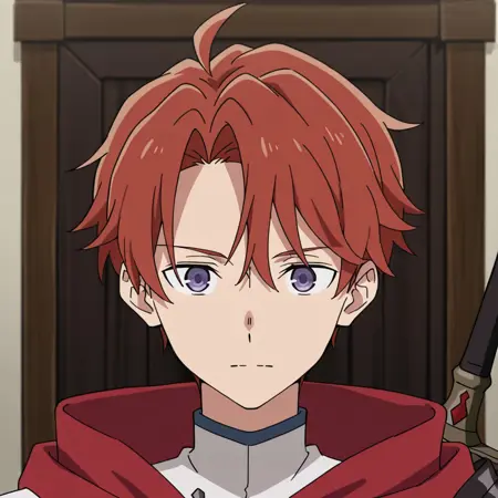 Abel_WM, Red hair, Brown Eyes, Red Cape, White Shirt, Leather Cuirass, Leather gauntlets, brown pants, leather boots, sword on back