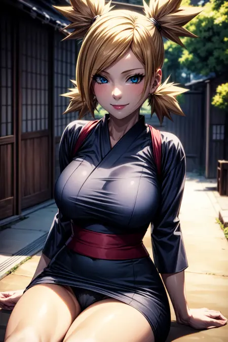 TemariNarutoNDV, 1girl, blonde hair, twintails, blue eyes, large breasts, quad tails, japanese clothes, forehead protector, black kimono