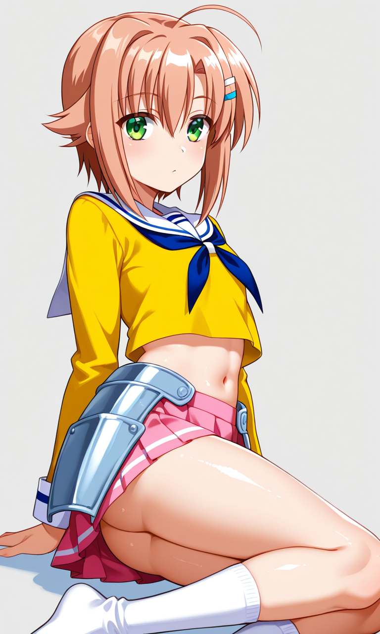 긴 소매, 미니스커트, 배꼽, 분홍 치마, 주름 치마, 학교 유니폼, 셔츠, 치마, 양말, 언더버트, 흰 양말, 노란 셔츠,