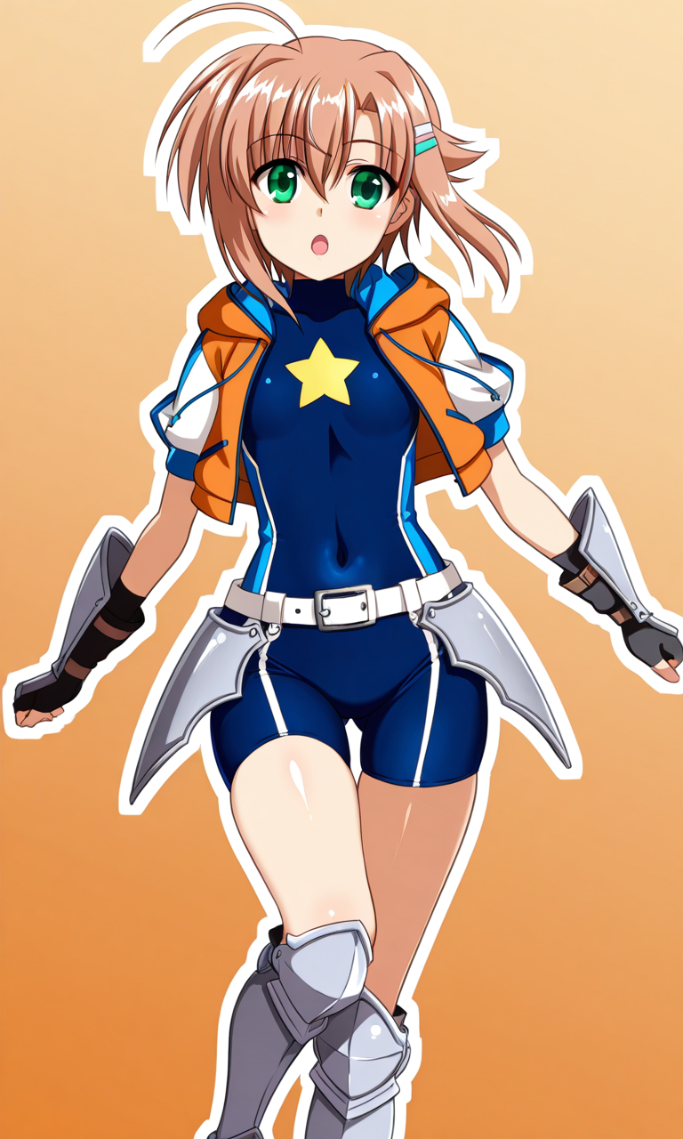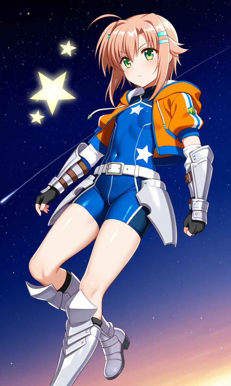 갑옷 부츠, 갑옷, 바이크 숏츠, 파란 셔츠, 파란 바디슈트, 검은 장갑, 바디슈트, 벨트, 부츠, 길이 단축된 재킷, 숨겨진 배꼽, 손가락 없는 장갑, 장갑, 겐틀레트, 정강이 보호대, 후드, 후드 내려짐, 후드 재킷, 재킷, 무릎 부츠, 다색 옷, 다색 재킷, 열린 옷, 열린 재킷, 주황색 재킷, 프린트 바디슈트, 셔츠, 짧은 소매, 별, 별(기호), 별 프린트, 트랙 재킷, 흰 신발, 흰 벨트, 흰 소매,