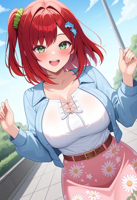 dwiruka, 红发, 中等长度头发, 绿色眼睛, 一侧扎起, 绿色发圈, 发丝垂落, 海豚发饰, 大胸部,