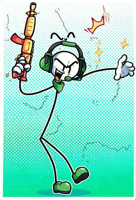 BSidesCharlesFNFVHS, 1boy, pale white head, circular head, bald, black eyes, no sclera, stick figure, stickman, pale white hands, bright green headset, bright green shoes, light green bandana,